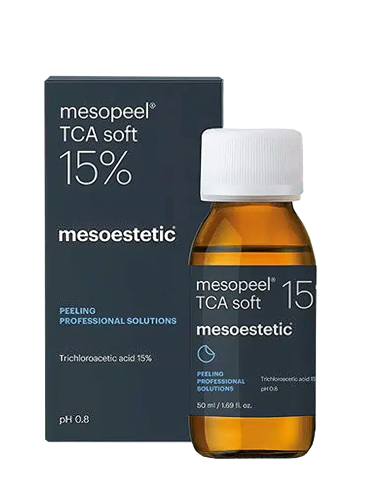 Mesoestetic Mesopeel TCA Soft 15% is a self-neutralizing trichloroacetic acid (TCA) peel with a concentration of 15%. It gently and gradually penetrates the skin, targeting aging signs, pigmented lesions, comedonal acne, and superficial acne scars.