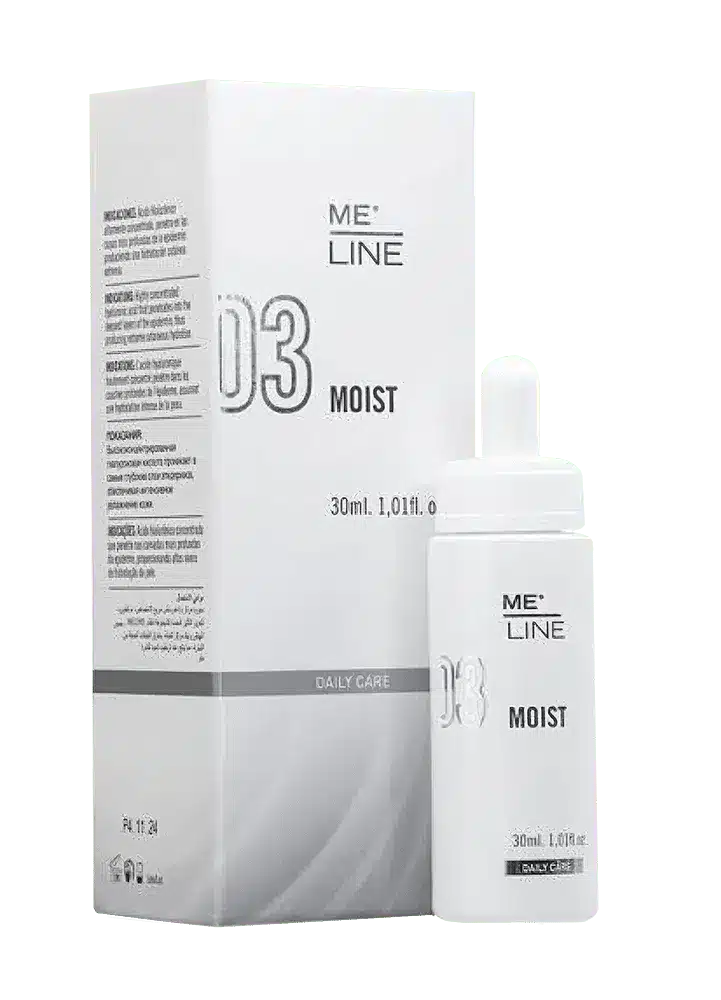 ME Line 03 Moist is a potent occlusive serum designed to regulate skin moisture levels and promote cell renewal. It features a blend of complete and fragmented hyaluronic acid molecules to restore the skin’s hydration balance.